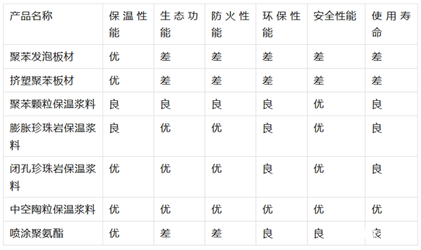 保温系统中的无机保温材料如中空玻化微珠、闭孔珍珠岩等的生态功能要比发泡聚苯板(EPS)、挤塑聚苯板(XPS)、喷涂聚氨酯(SPU),聚苯颗粒等有机保温材料的生态功能要好;颗粒粉状保温浆粒的生态功能要比喷涂聚氨酯、聚苯板等板材类薄抹灰系统的生态功能更好。