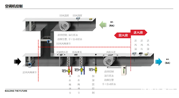 上图为空调机组的示意图,空调机组有新风段,送风段,回风段,排风段。新风段到送风段有1层过滤网,冷热水调节阀,风机,常规会在过滤网安装空气压差开关检测滤网是否堵塞,在冷热水管上安装防冻开关保证冷热水供应,在送风段出口处,安装风管温湿度传感器和风管压力,来检测送风的温度、湿度以及风的大小。