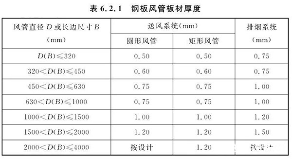 表1:风管板材厚度规范要求