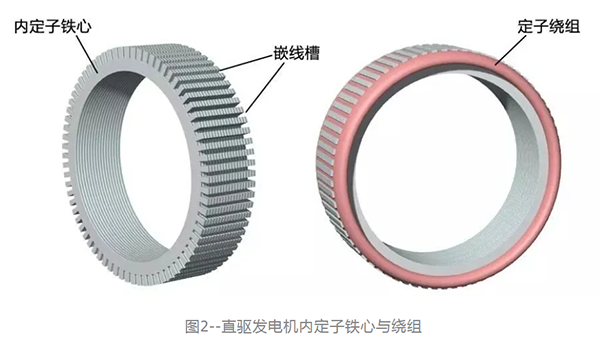 下面介绍直驱外转子永磁风力发电机组的组成与结构,通过一个永磁外转子发电机模型介绍其构造,图3左图是内定子铁心图,定子铁心由导磁良好的硅钢片叠成,定子铁心外周有许多槽,发电机的绕组就嵌装在槽内,绕组是按三相规律分布。