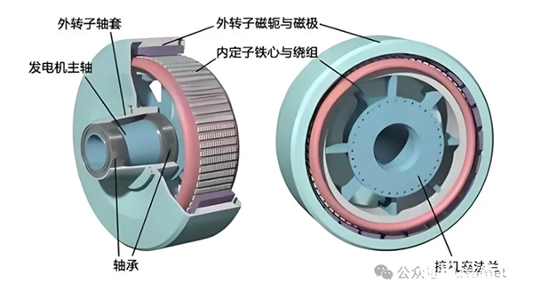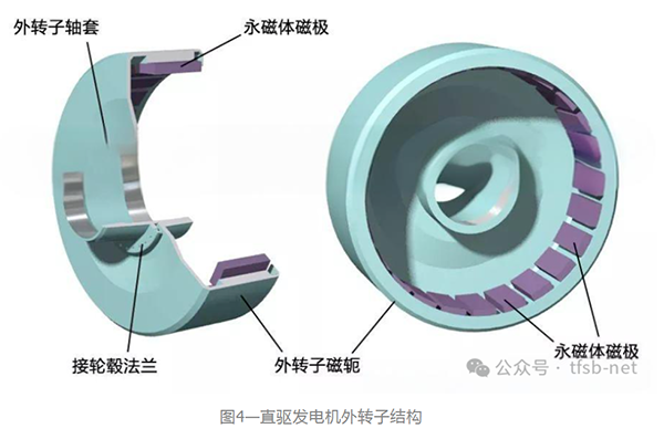 把外转子安装在发电机主轴上,组成外转子发电机,下图从两个方向展示其结构。外转子轴套既固定外转子,还要安装整个风轮,承受很大的负荷,所以通过两个大轴承安装在发电机主轴上。