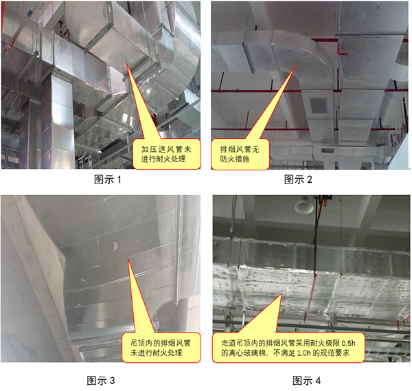 1.防烟、排烟管道未进行防火处理和不燃材料进行隔热,其耐火极限未达到设计或规范要求;【图示1】【图示2】【图示3】